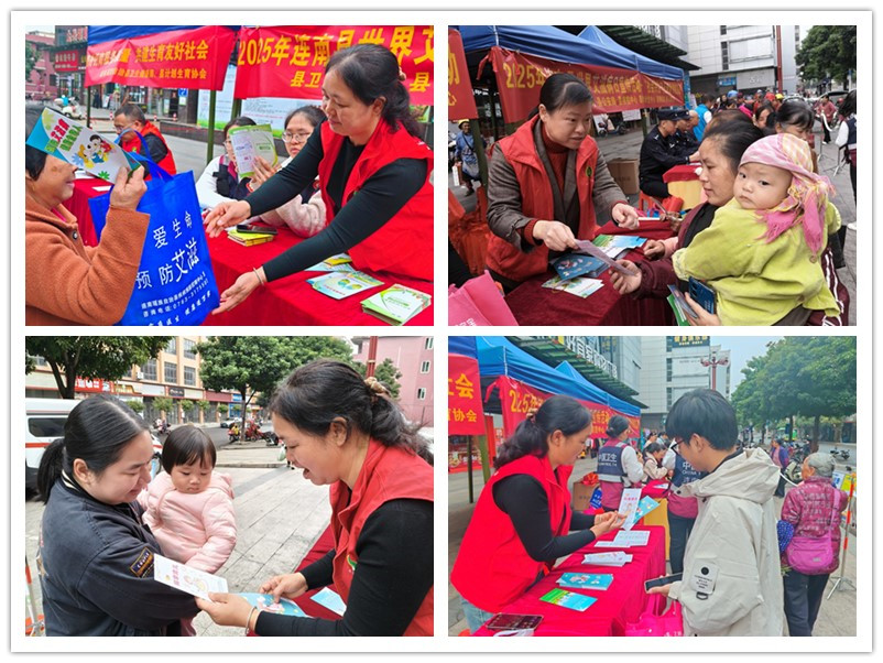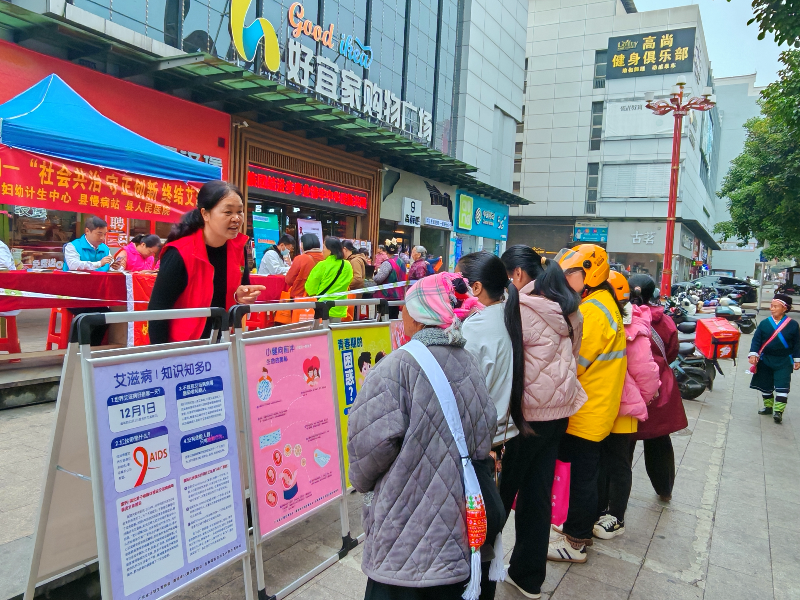 2025年12月1日,上午,各部门立足职能协同发力。县卫生健康局统筹调度,宣传现行生育政策及艾滋病防治核心政策,为群众明晰防治工作方向;县计划生育协会聚焦育龄人群,通过发放宣传手册、现场答疑,普及防艾知识与健康生活理念,推广安全防护措施;县疾控中心向群众讲解艾滋病的三大传播途径、日常预防措施及暴露后阻断知识,重点澄清“日常接触会传染”的认知误区,引导群众科学看待艾滋病感染者;县妇幼中心讲解优生优育、科学育儿及生殖健康等知识,针对孕产妇等重点人群,重点宣传母婴阻断技术、新生儿随访检测等服务,筑牢母婴健康防线;县慢病站、三江卫生院则围绕艾滋病与慢性病协同管理,为群众提供个性化健康指导,强调规范治疗的重要意义,宣传公共卫生、肺结核及乙肝筛查等等。工作人员向群众派发三孩生育政策、优生优育、科学育儿、防艾知识手册等宣传折页及宣传品。