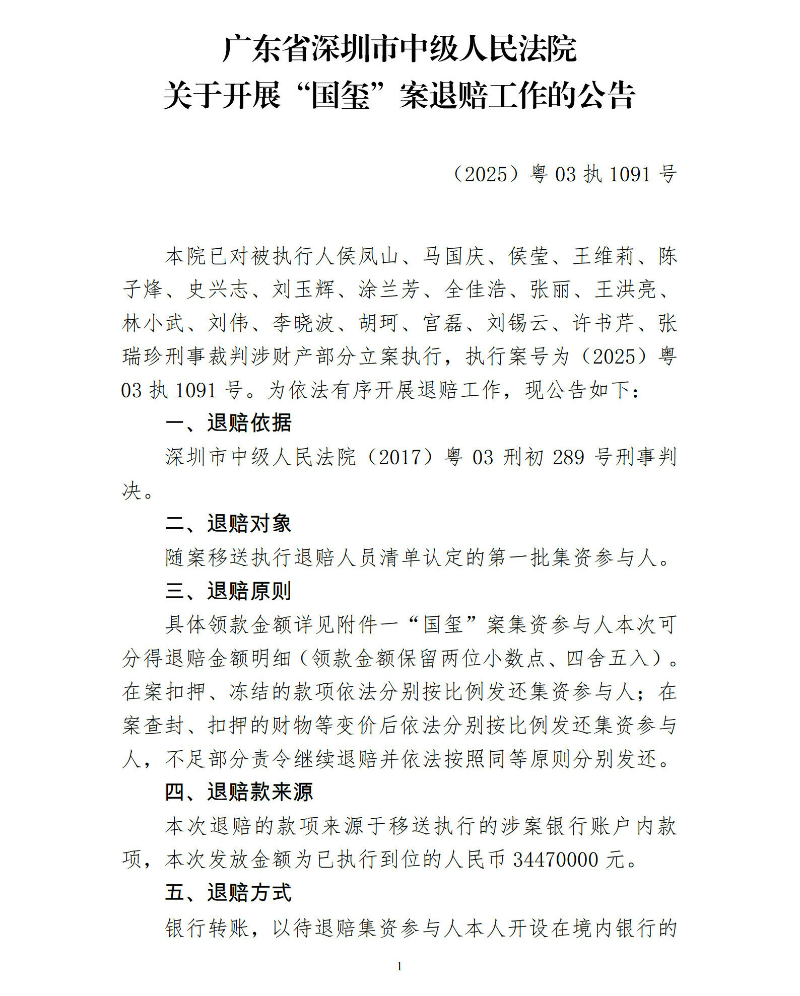 广东省深圳市中级人民法院关于开展“国玺”案退赔工作的公告